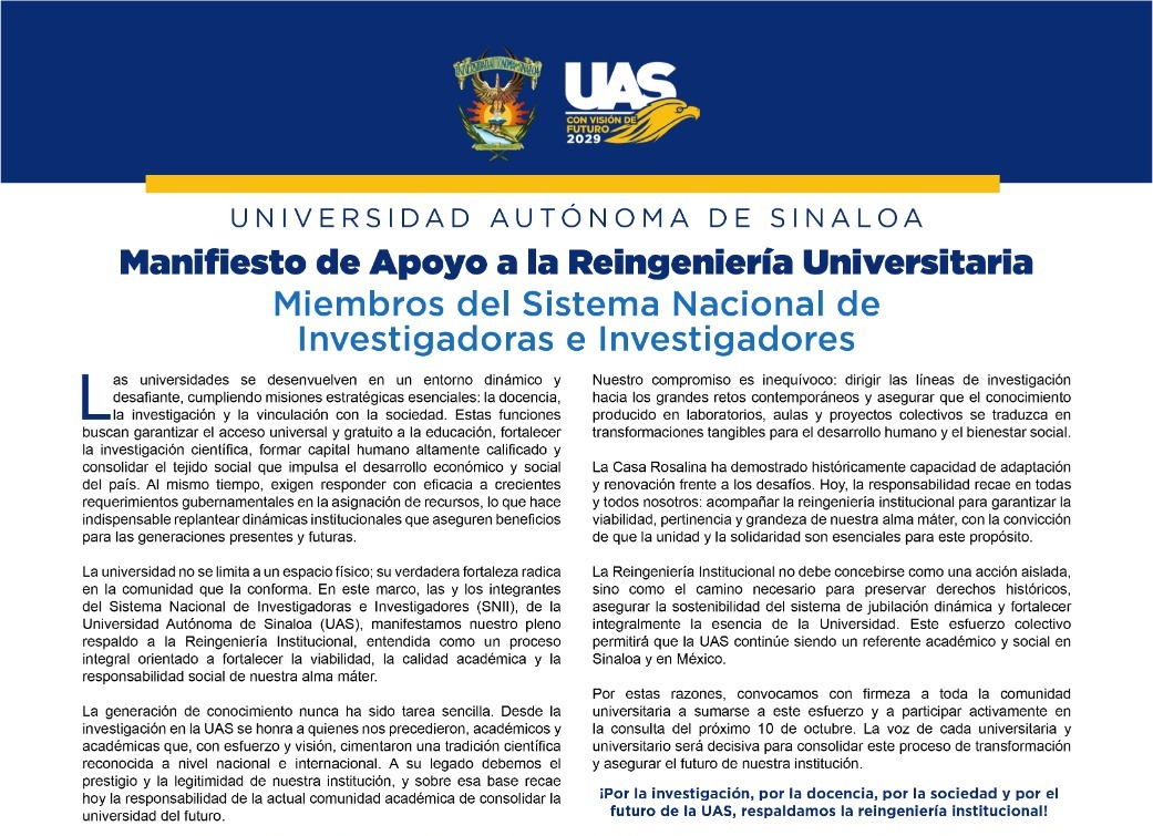 A través de un manifiesto, 436 universitarios miembros del Sistema Nacional de Investigadoras e Investigadores (SNII) convocaron con firmeza a toda la comunidad de la Universidad Autónoma de Sinaloa (UAS) a sumarse a la reingeniería integral y a participar activamente en la consulta del próximo 10 de octubre, señalando que la voz del cada universitaria y universitario será decisiva para consolidar este proceso de transformación y asegurar el futuro de la institución.