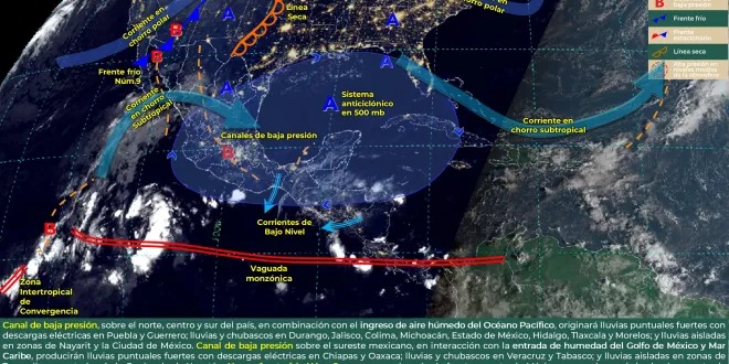 Para hoy, un canal de baja presión, extendido sobre el norte, centro y sur del país, en combinación con el ingreso de aire húmedo del Océano Pacífico, originará lluvias puntuales fuertes con descargas eléctricas en Puebla y Guerrero; lluvias y chubascos en Durango, Jalisco, Colima, Michoacán, Estado de México, Hidalgo, Tlaxcala y Morelos; y lluvias aisladas en zonas de Nayarit y la Ciudad de México.