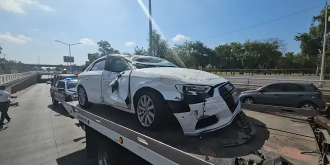 Ahí el chofer del Audi después chocó y tumbó una luminaria y volcó en el lugar, el conductor del Nissan March chocó un Kia K3 gris y chocó contra el muro de contención.