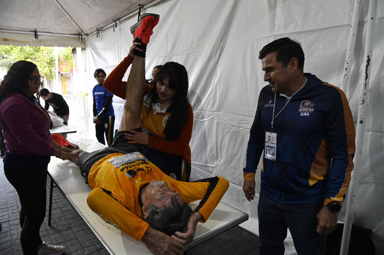 Demostrando humanismo en el quehacer y gran ética, especialista en rehabilitación física de la Universidad Autónoma de Sinaloa (UAS) estuvieron recibiendo, a un lado de la meta, a todos aquellos corredores que fueron terminando su participación dentro de la edición 34 del Maratón Internacional de Culiacán 2025, hecho que ayuda a los maratonistas, aun cuando no presentan dolor a que los músculos recobren elasticidad y se relaje, evitan pues lesiones de aparición tardía, por lo que los beneficiarios mostraron agradecimiento por este noble acto.