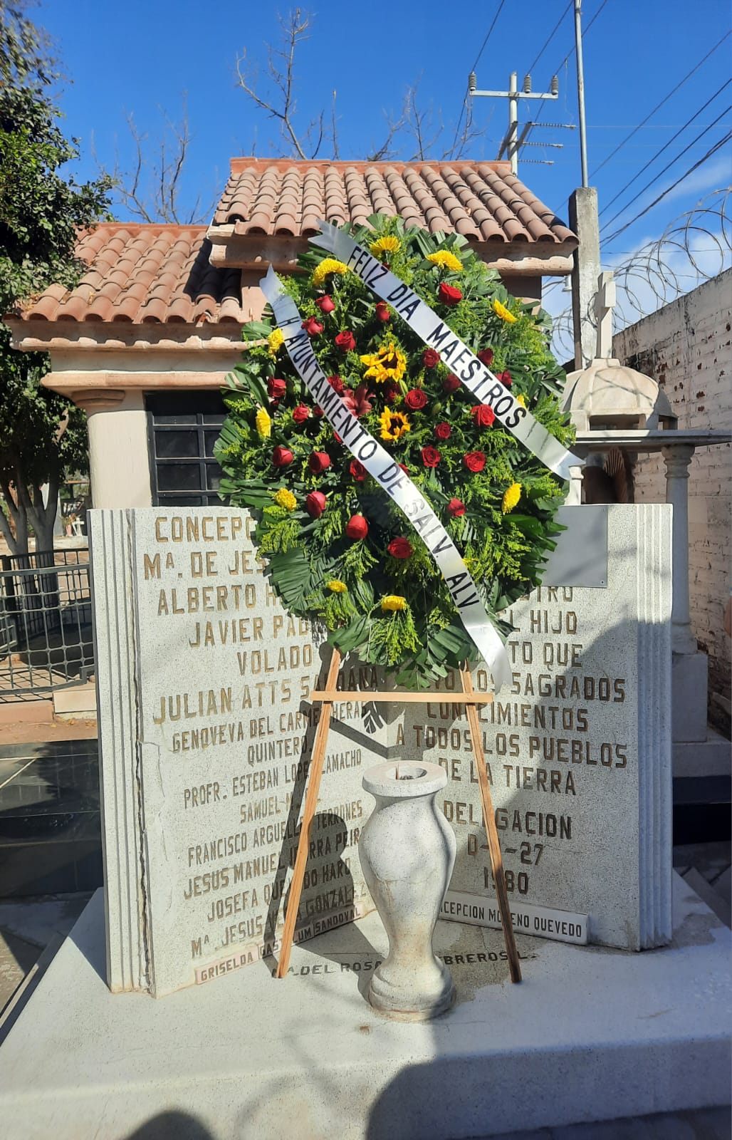 El presidente municipal, Armando Camacho Aguilar, junto con autoridades locales, rindió una ofrenda floral en honor y reconocimiento a los docentes que han partido en el Panteón Municipal y en la Plazuela Municipal, específicamente junto al Monumento al Maestro.