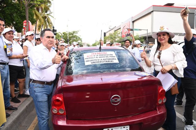 Es un reclamo que hoy estamos haciendo de que se nos deje en paz, de que se nos deje trabajar para seguir sacando adelante las funciones sustantivas de la Universidad (…) en este momento estamos siendo perseguidos políticos, lo he dicho en diferentes ocasiones que vamos a seguir de pie, que no nos vamos a doblar ante ninguna amenaza; hoy en día estamos siendo amenazados por parte de la Fiscalía a través del Ministerio Público y de los jueces, quieren doblar a la Universidad, porque quiere quedarse con ella, eso es lo que tenemos que denunciar al pueblo de Sinaloa”, expresó el Rector cobijado por la sombra de Catedral en la avenida Álvaro Obregón.