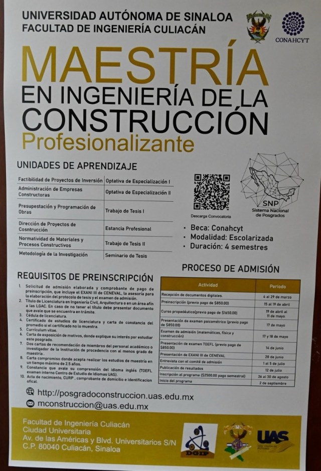 El coordinador de la Maestría en Ingeniería de la Construcción planteó que desde que inició este programa de postgrado en el año de 2014, la Universidad Autónoma de Sinaloa ha logrado egresar aproximadamente 50 muchachos que ya se encuentran laborando ya sea en la academia o en algunas áreas de la rama de la construcción.