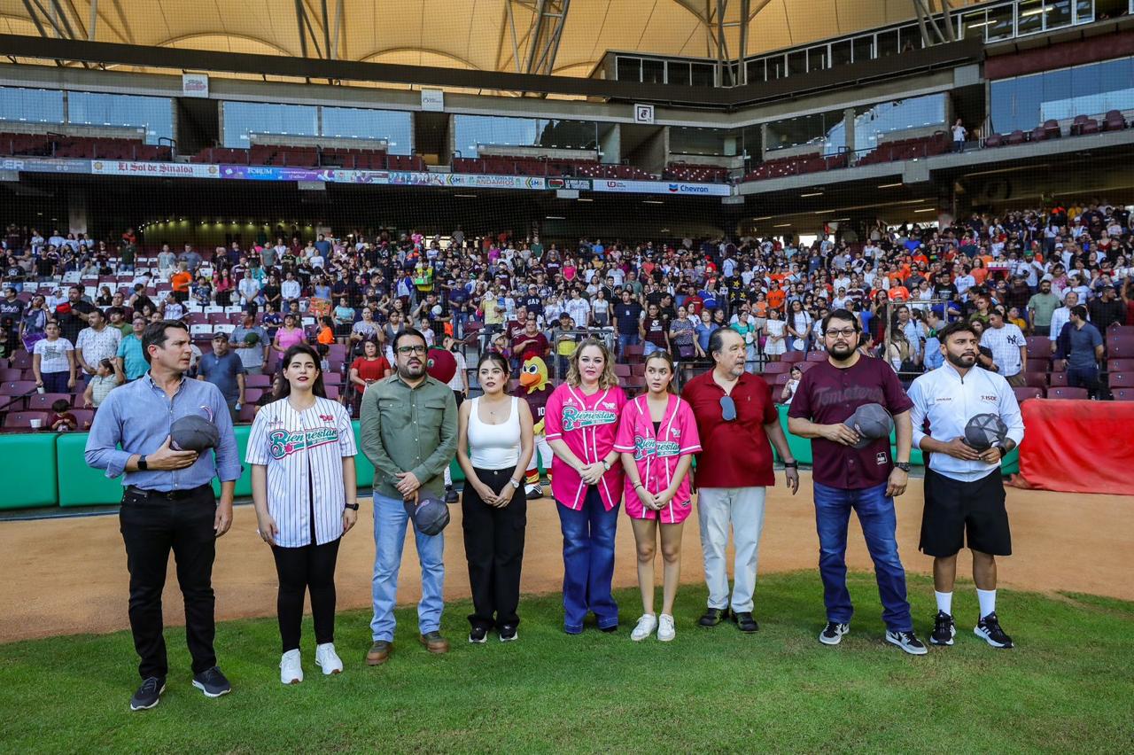 Previo al inicio del partido, Eneyda Rocha Ruiz y el niño Jesús Alberto Villarreal Ceballos, quien padece glaucoma avanzado y será beneficiado con este programa, realizaron el primer lanzamiento junto a jugadores de Tomateros de Culiacán y Cañeros de Los Mochis.