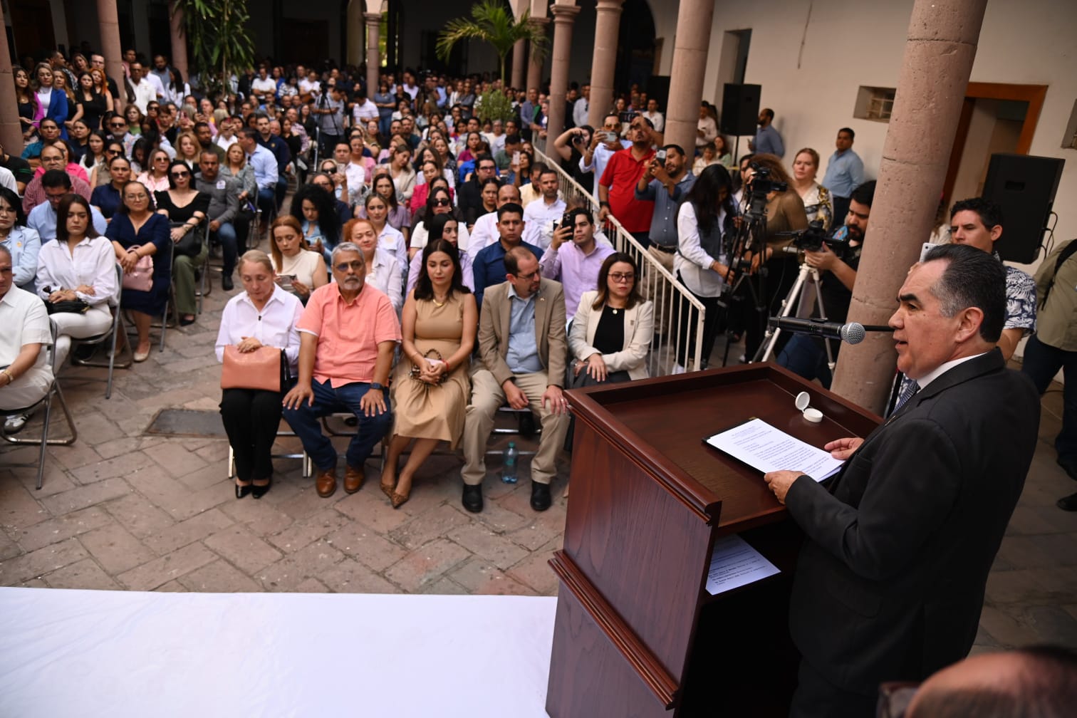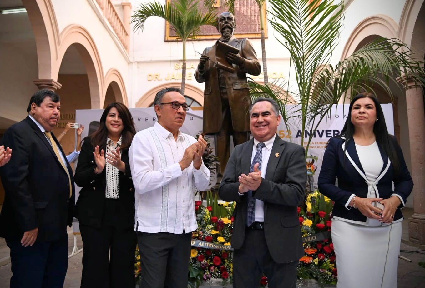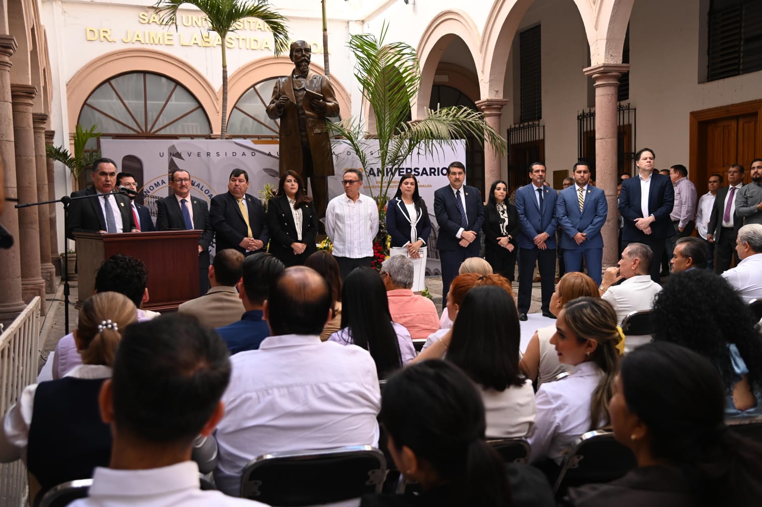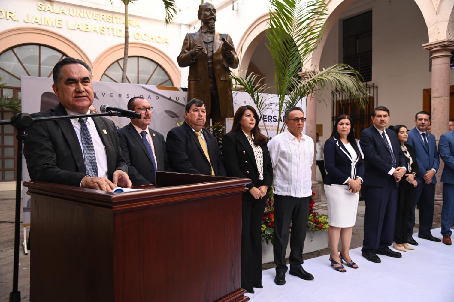 Hoy que estamos aquí, reunidos frente a la figura de Don Eustaquio Buelna Pérez, reiteremos nuestra certeza de que pertenecer a la UAS es asumir un legado de excelencia, es fortalecer sus valores científicos y humanistas, y proyectar su grandeza hacia un futuro con responsabilidad y orgullo”, externó.