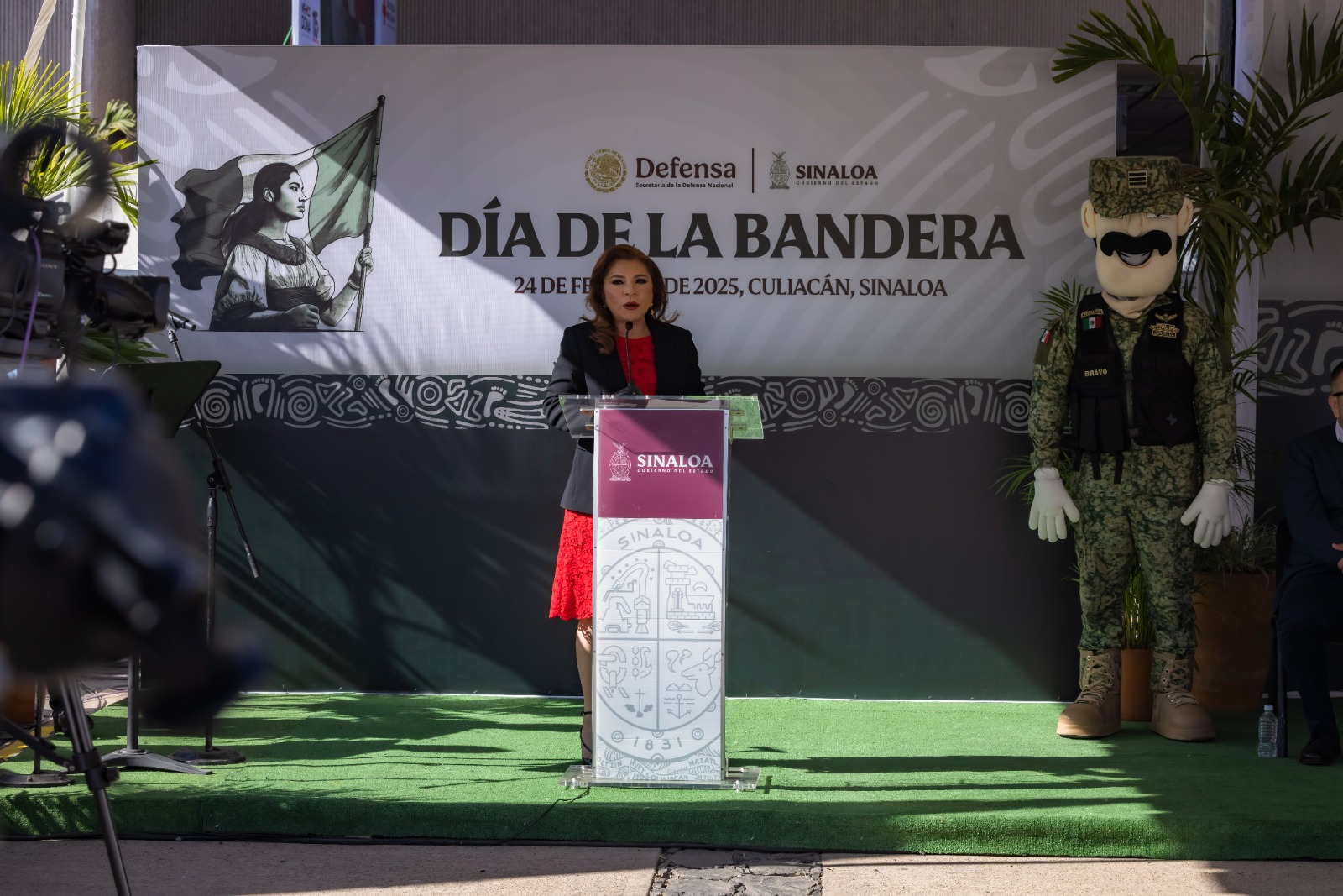 Luego del izamiento de la bandera monumental a cargo del gobernador del estado, correspondió a la secretaria de Educación Pública y Cultura, Gloria Himelda Félix Niebla, pronunciar el discurso oficial, donde después de hacer una reseña histórica del origen de la bandera nacional, destacó que hoy el mundo vive momentos de incertidumbre, la reconfiguración de un orden internacional que socava los cimientos de las relaciones entre los pueblos y los gobiernos, y que pretende alterar este modelo de convivencia poniendo en peligro una relación civilizada, de respeto y racional.