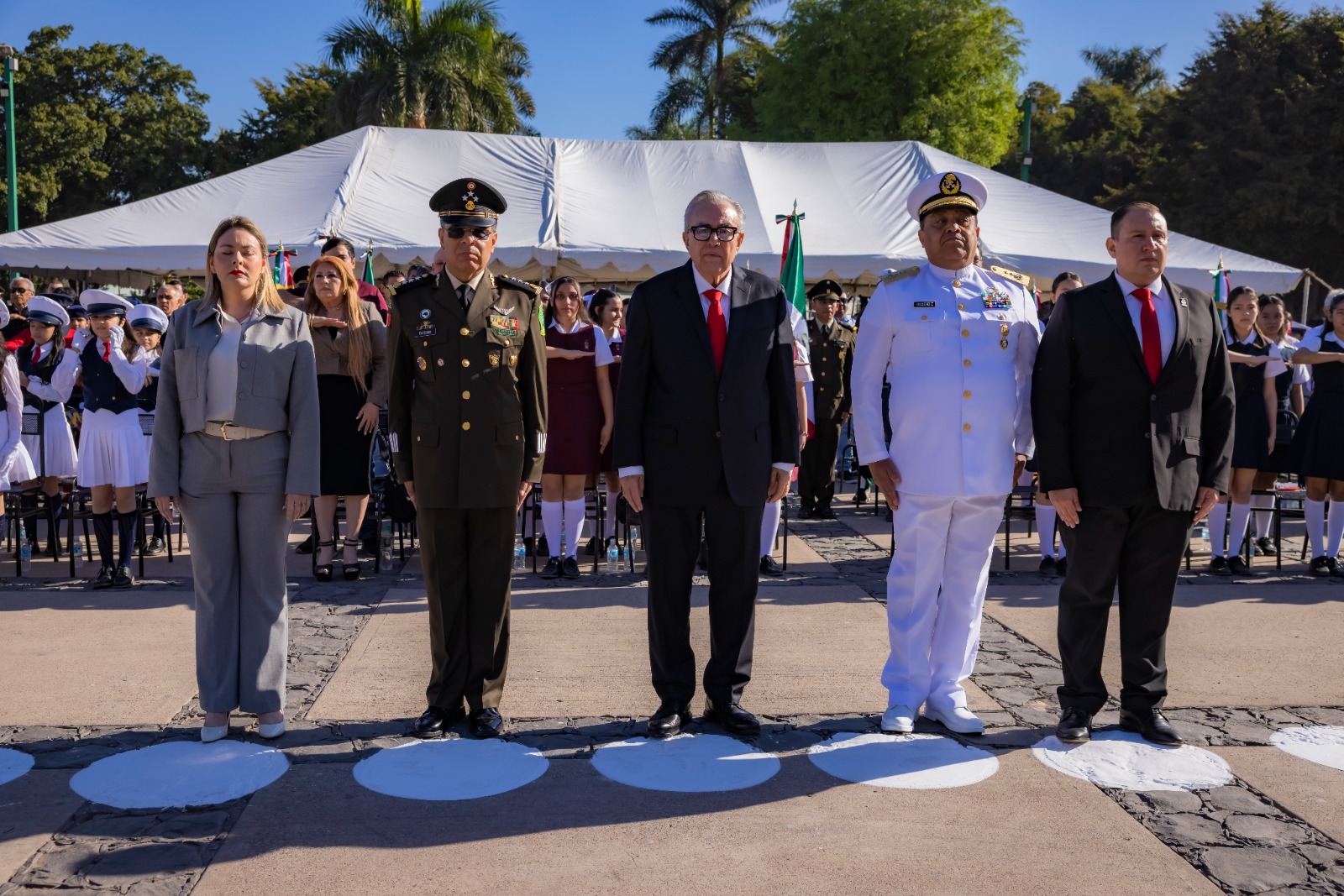Durante el evento que tuvo lugar en la explanada de Palacio de Gobierno, se realizó un enlace con el acto conmemorativo que simultáneamente encabezó la presidenta de la República, Claudia Sheinbaum Pardo, desde el Zócalo de la Ciudad de México.