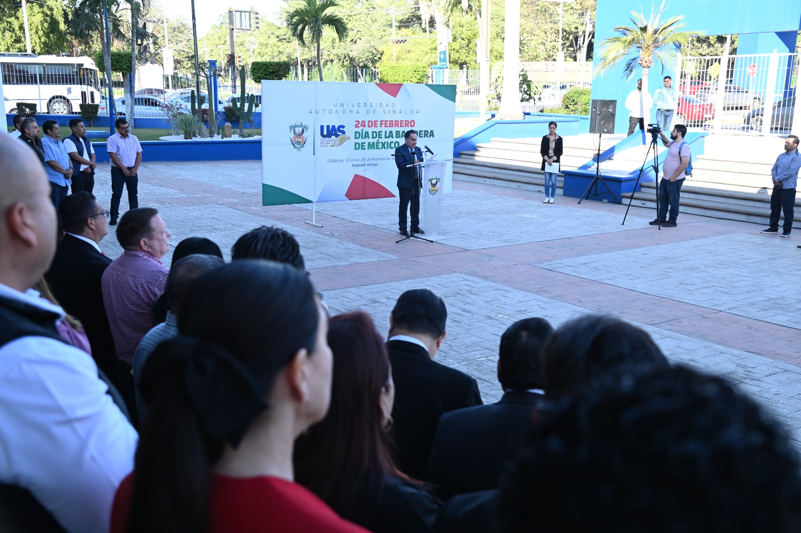 Al conmemorar el Día de la Bandera, el Rector de la Universidad Autónoma de Sinaloa (UAS), doctor Jesús Madueña Molina, exhortó a enarbolar también las banderas de la educación de calidad, la unidad como mexicanos y universitarios, la defensa de la soberanía y la búsqueda incansable de una paz duradera que nos darán fortaleza para seguir avanzando en todos los terrenos.
