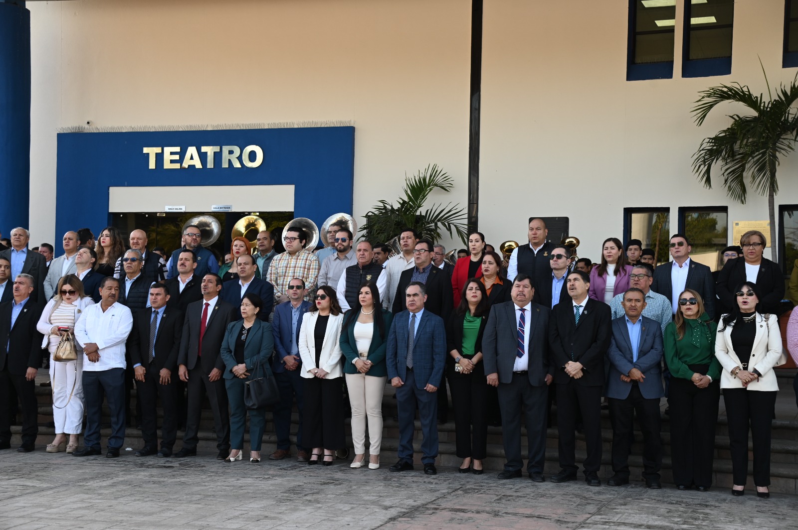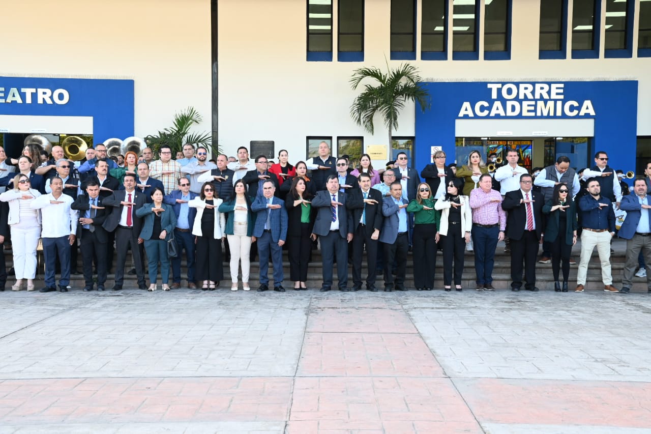 Ante estudiantes, docentes y funcionarios reunidos en la explanada de la Torre Académica el Rector encabezó el izamiento de bandera y homenaje al lábaro patrio donde se pronunció por el diálogo incluyente, responsable y de buena voluntad para resolver conflictos y refirió que el país enfrenta los embates de un socio que se ha olvidado de la historia, que trata de imponer una agenda, por ello la actitud de los mexicanos debe ser de unidad, de un nacionalismo inteligente que defienda sus intereses sin cerrarse al mundo.