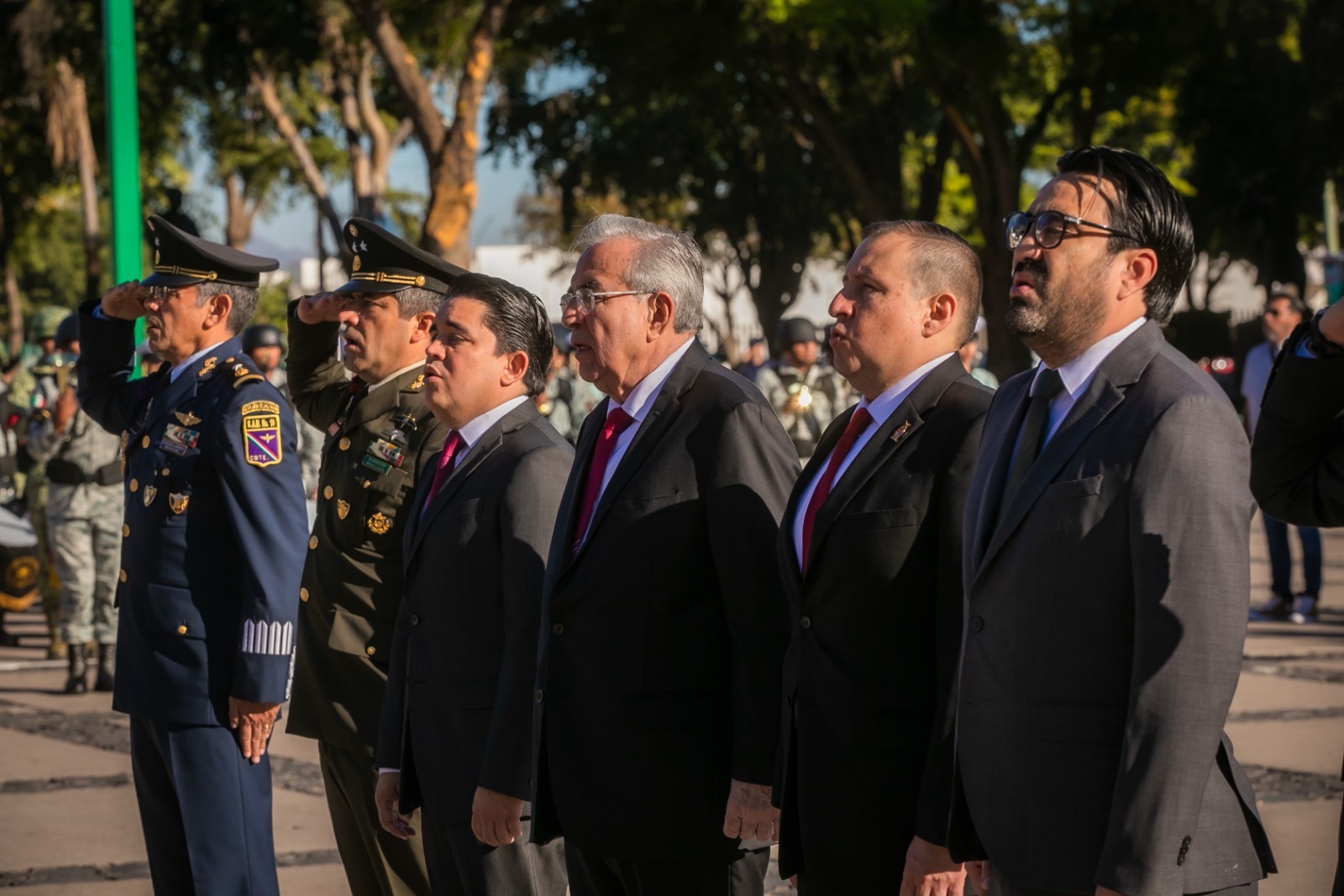 Las autoridades civiles y militares que acompañaron al gobernador Rubén Rocha Moya en este acto conmemorativo fueron el presidente de la Mesa Directiva del H. Congreso del Estado de Sinaloa Ricardo Madrid Pérez, el presidente del Supremo Tribunal de Justicia Jesús Iván Chávez Rangel, el presidente municipal de Culiacán Juan de Dios Gámez Mendívil, el comandante de la 9/a Zona Militar Alfredo Salgado Vargas, el coordinador estatal de la Guardia Nacional en Sinaloa Francisco Arellano Ávila, el comandante de la Base Aérea Militar No. 10 en Sinaloa José Miguel de Luna Genel.