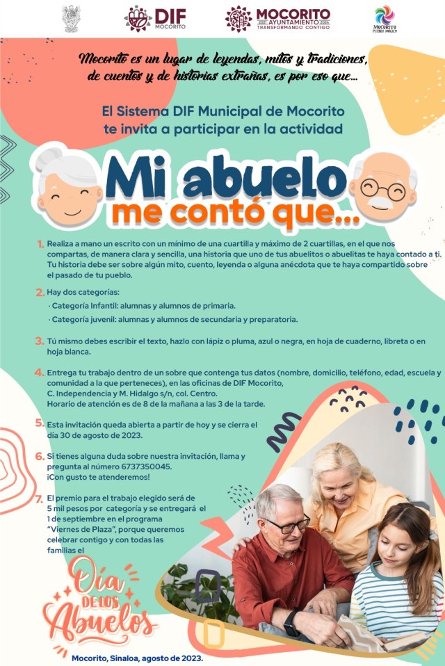 Mocorito, Sinaloa, (Paher Portal).- El H. Ayuntamiento de Mocorito en coordinación con el Sistema DIF Municipal que presiden María Elizalde Ruelas y Guillermo Galindo Castro respectivamente, están realizando una atenta invitación a todos los niños y niñas de primaria, así como a jóvenes de secundaria y preparatoria del municipio de Mocorito, a que participen en su bonito evento organizado para celebrar el Día de los abuelos.