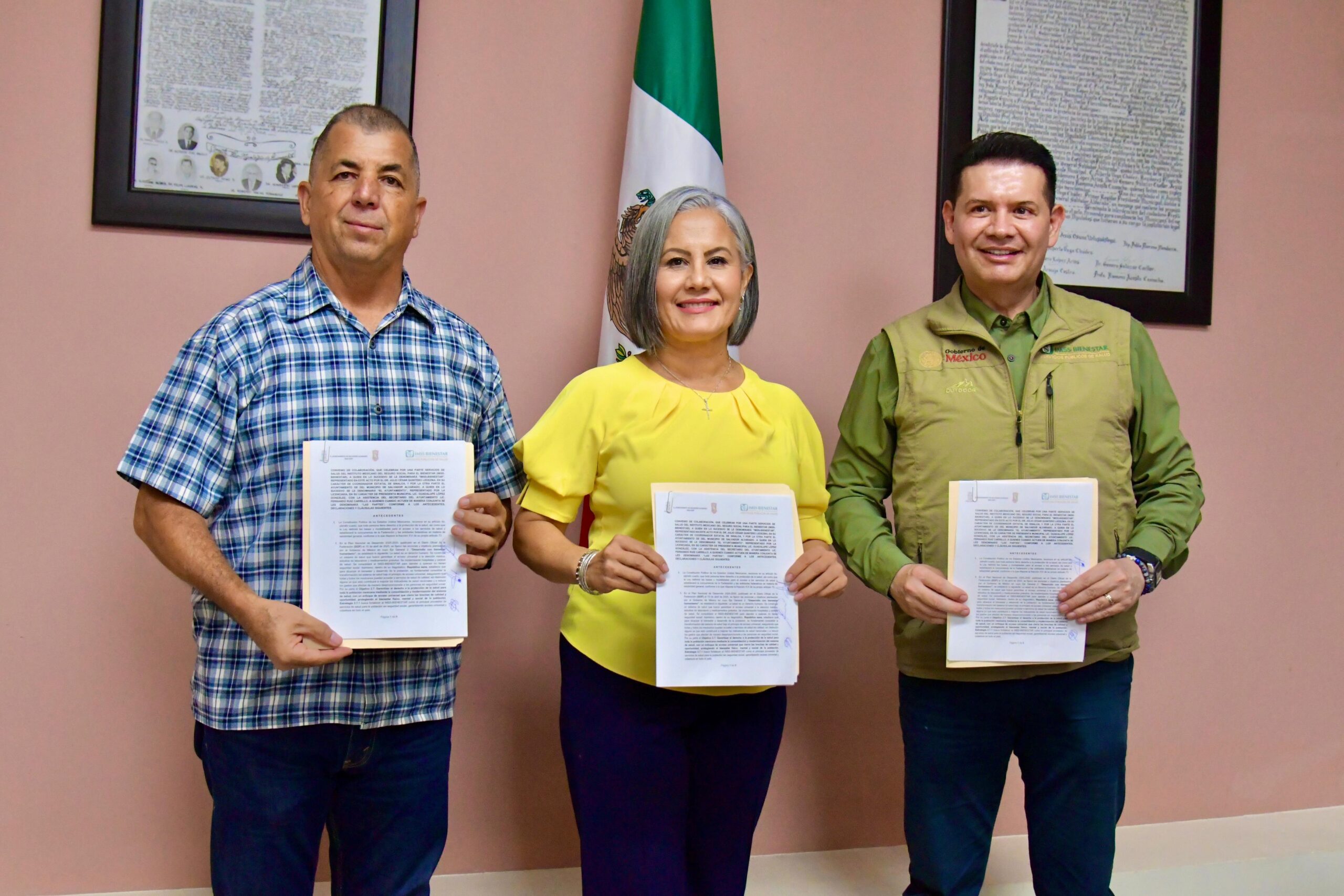Guamúchil, Sinaloa; (Paher Portal).- El Ayuntamiento de Salvador Alvarado, encabezado por su presidenta municipal, Lupita López González, formalizó un convenio con el coordinador estatal de los Servicios de Salud del Instituto Mexicano del Seguro Social para el Bienestar en Sinaloa, Dr. Julio César Quintero Ledezma, con el objetivo de instalar un módulo de afiliación al IMSS-Bienestar dentro del Ayuntamiento. Esta iniciativa busca garantizar que las personas que no cuentan con seguridad social puedan acceder a servicios médicos básicos y recibir atención oportuna.