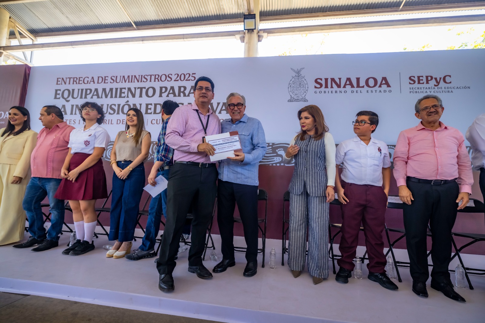 La entrega de suministros para el equipamiento de la inclusión educativa a planteles de educación pública nivel básico del estado de Sinaloa, consistieron en mobiliario tanto para alumnos como maestros, además de material diverso para el mantenimiento de las aulas.