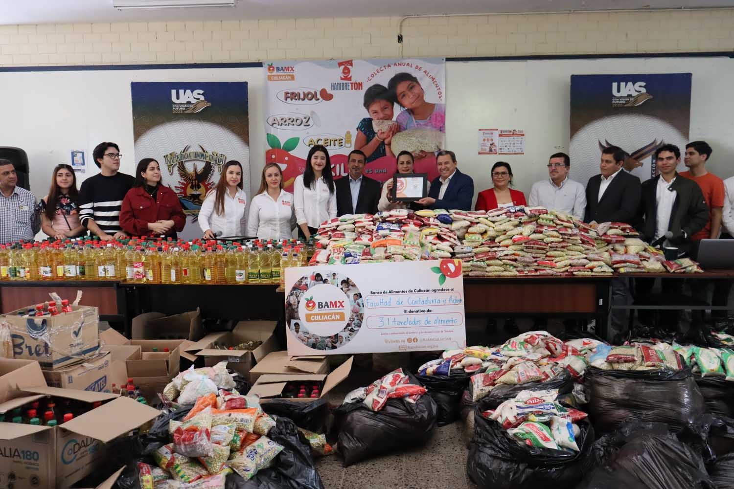 La Universidad Autónoma de Sinaloa (UAS) a través de la Facultad de Contaduría y Administración (FCA) entregó al Banco de Alimentos de Culiacán IAP, un total de 3.1 toneladas de frijol, arroz y aceite que fueron recaudados por la comunidad universitaria en la campaña “Hambretón” 2024 y que beneficiará a alrededor de 12 mil personas de comunidades afectadas del Centro- Sur de Sinaloa.