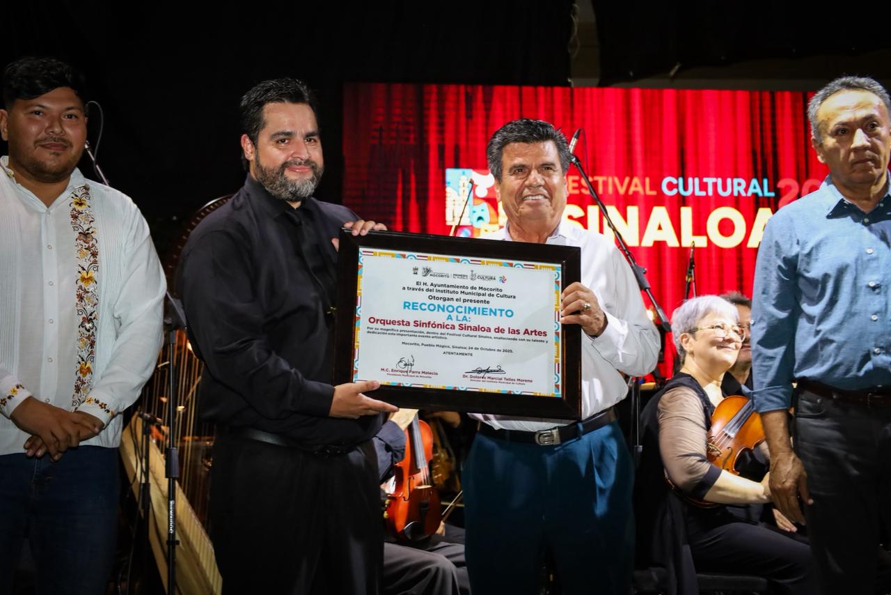 Al término del concierto, el presidente municipal, Enrique Parra Melecio, hizo entrega de un reconocimiento especial a la OSSLA, destacando su trayectoria y valiosa aportación al arte y la cultura del estado. En su mensaje, el alcalde expresó su agradecimiento y reconocimiento a la orquesta, señalando que su presentación reafirma el orgullo que representa para Mocorito ser reconocido como la Atenas de Sinaloa, un referente histórico y vigente en el ámbito cultural.