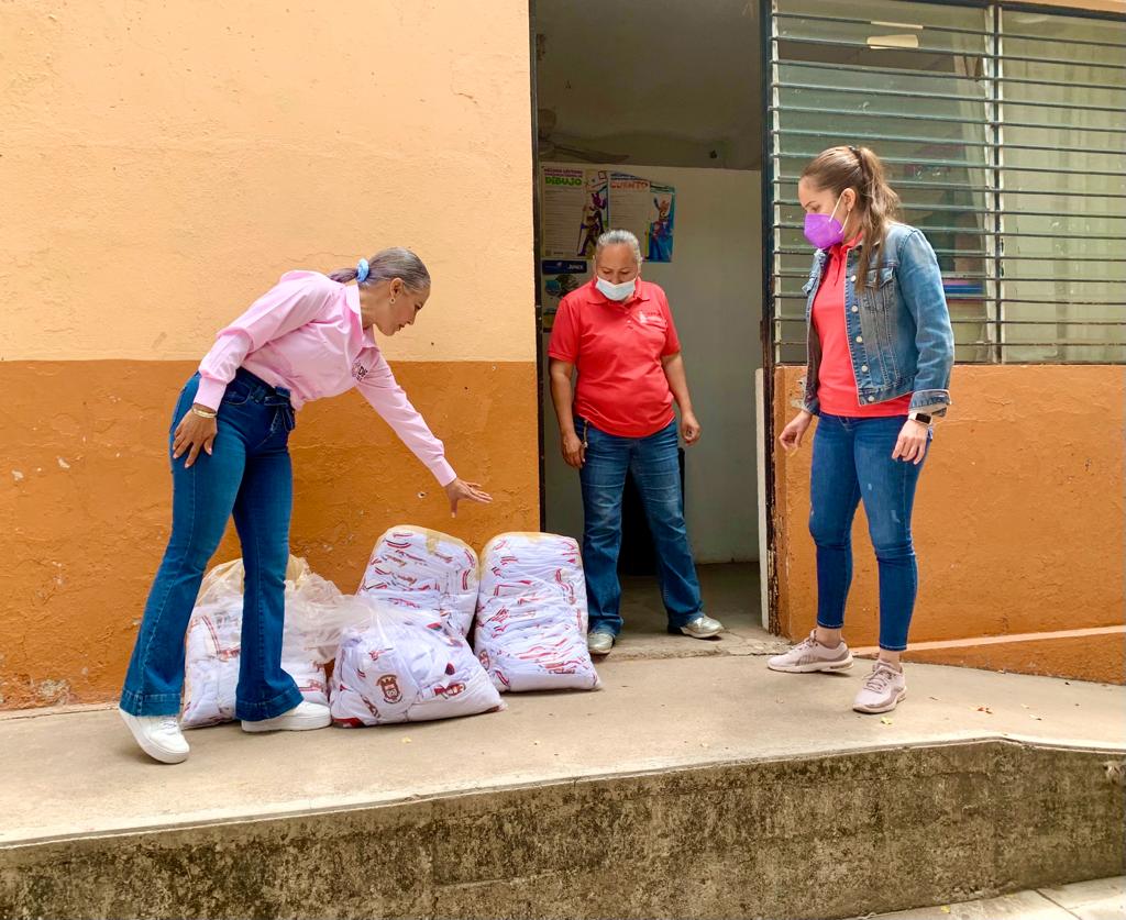 Gracias a la donación de una tienda que provee a la comunidad de uniformes escolares, la esposa del alcalde Armando Camacho, Lupita López, acudió a algunas escuelas a entregar las prendas