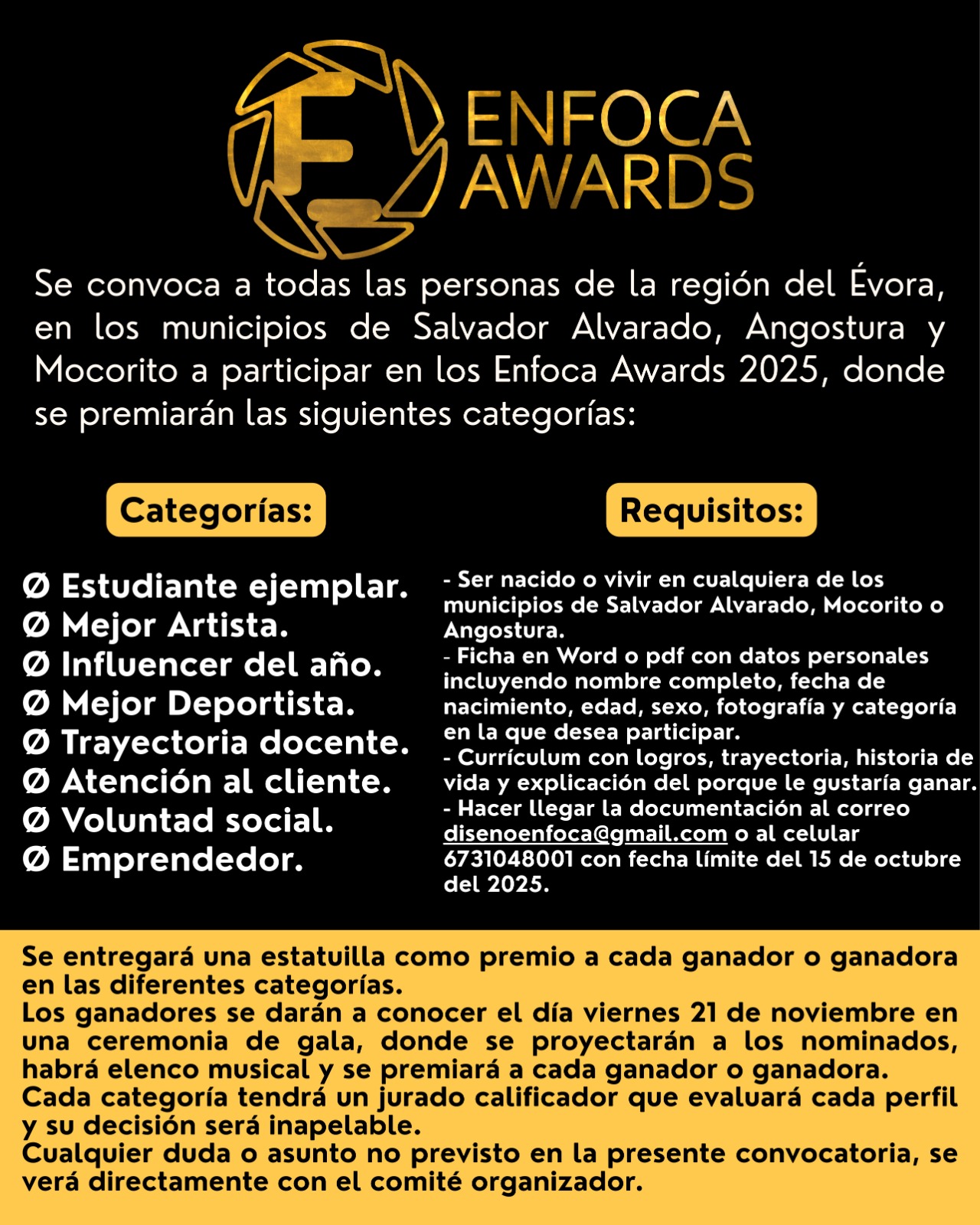 La convocatoria está dirigida a personas nacidas o residentes en los municipios de Salvador Alvarado, Angostura y Mocorito, quienes podrán postularse en ocho categorías: