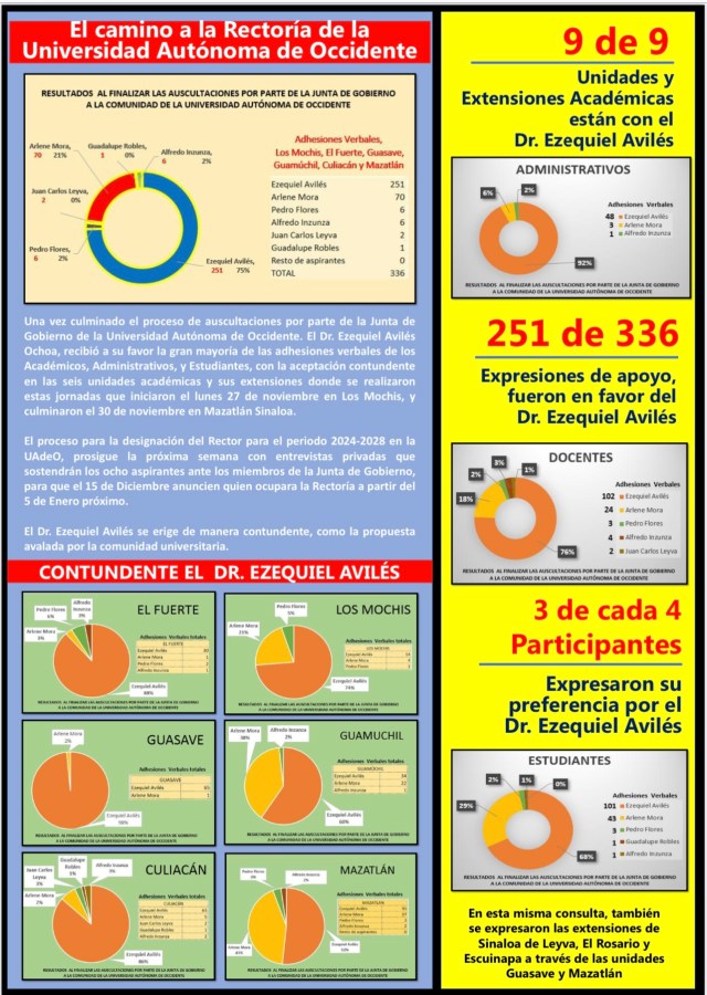 En esa participación verbal se pudo percibir la gran aceptación que tiene el Dr. Ezequiel Avilés Ochoa donde de 336 participantes de la comunidad universitaria obtuvo 251 opiniones favorables que representan el 75% de preferencia dejando claro que tres cuartas partes de los que participaron están totalmente convencidos de su proyecto de trabajo, su trayectoria en la UAdeO, su perfil de Profesor Investigador, su conocimiento del quehacer en la universidad y fuera de la institución para gestionar beneficios que vengan a dar respuesta a las demandas de alumnos, profesores y administrativos dando con esto el rumbo que la institución educativa necesita de manera urgente para dar atención y educación de calidad a los más de veinte mil estudiantes de sus 28 programas educativos de Licenciatura que tiene en el estado de Sinaloa.