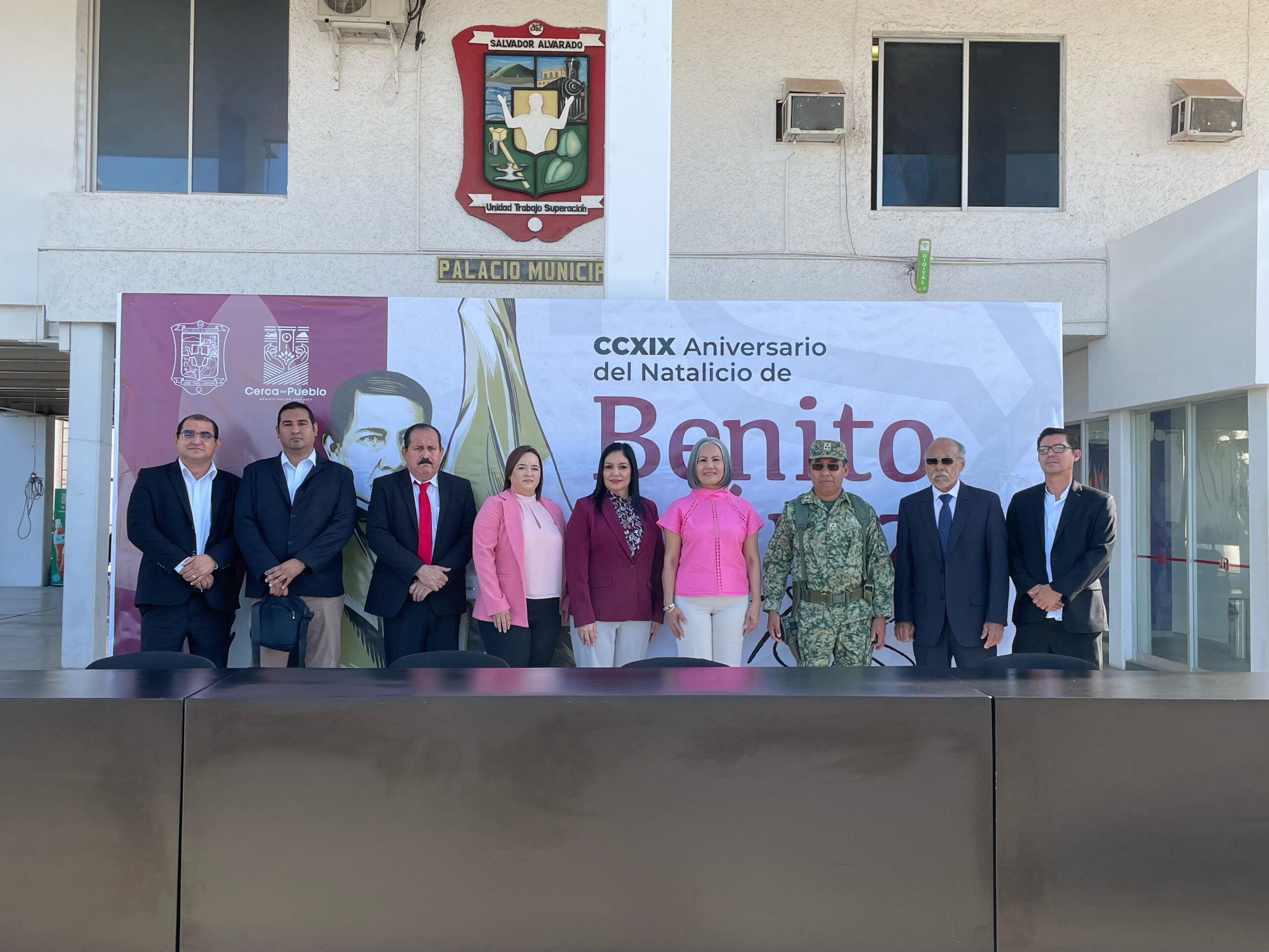 Guamuchil, Sinaloa,(Paher Portal).- El Ayuntamiento de Salvador Alvarado realizó dos actos cívicos para conmemorar el 219 aniversario del natalicio de Benito Juárez, uno en la explanada de la presidencia municipal y otro en la sindicatura de Villa Benito Juárez, ambos encabezados por la presidenta municipal Lupita López González, en donde también asistieron autoridades civiles, militares, regidores, funcionarios y ciudadanos, para recordar el legado del Benemérito de las Américas.