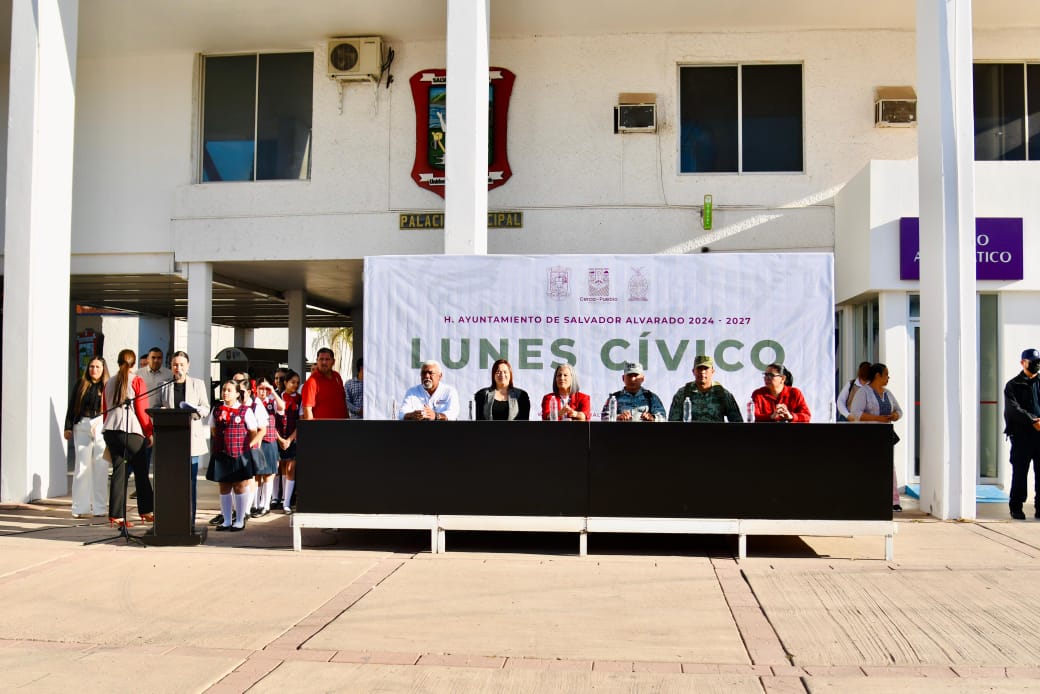 Guamuchil, Sinaloa, (Paher Portal).- Se llevó a cabo el primer lunes cívico de la administración encabezada por Lupita López González, presidenta municipal de Salvador Alvarado, con un evento celebrado en la explanada de la presidencia municipal donde participaron las escuelas primarias Vicente Guerrero (Ford #8) y Samuel M. Gil, cuyos alumnos protagonizaron las actividades cívicas del acto.