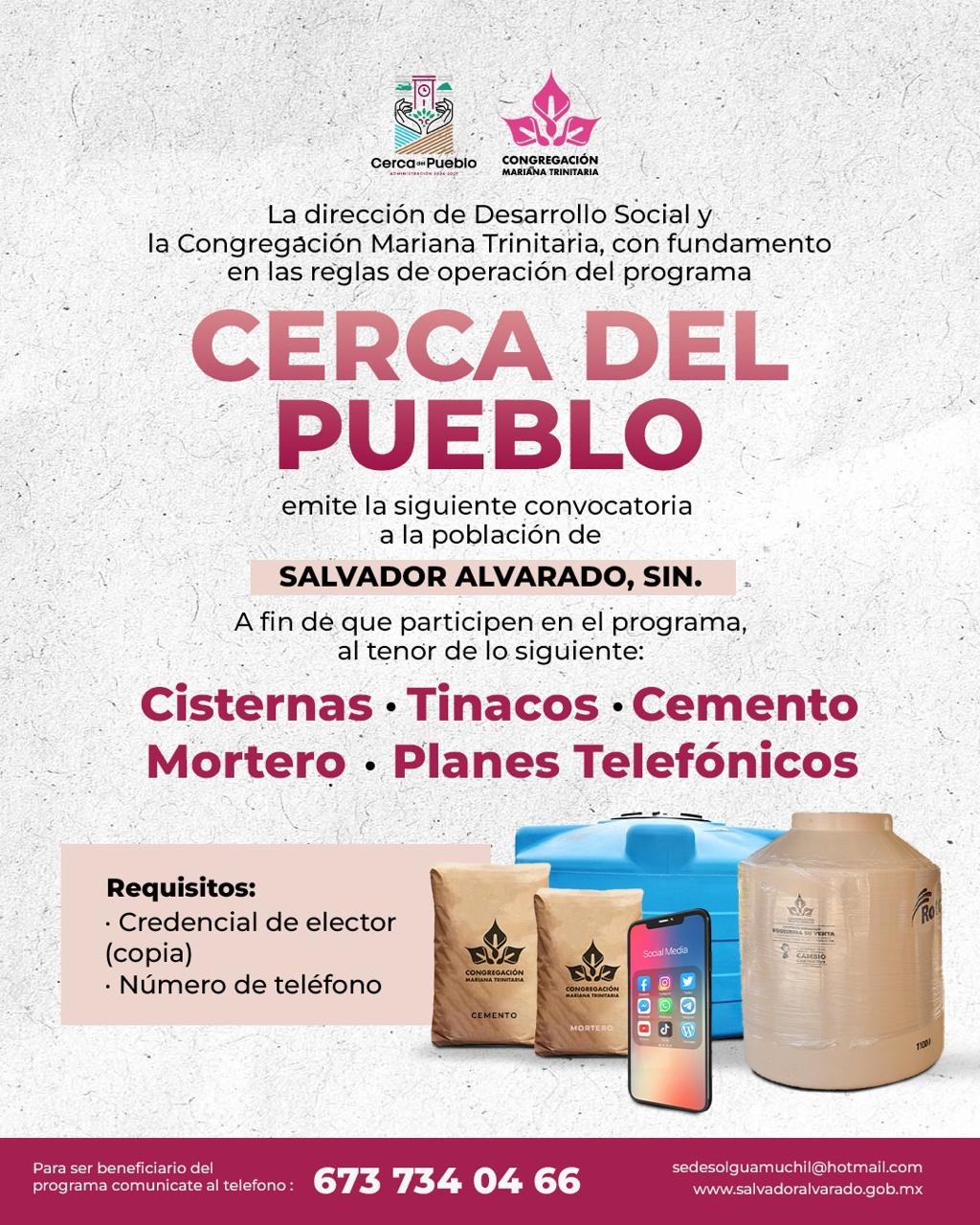 El director de Desarrollo Social, Daniel Mejía Montoya, dio a conocer que lo disponible incluye: cisternas, tinacos, cemento mortero y planes telefónicos, los requisitos para acceder son copia de la credencial de elector y un número de teléfono de contacto. Guamúchil, Sinaloa,(Paher Portal).- El Gobierno Municipal de Salvador Alvarado, a través de la Dirección de Desarrollo Social y bajo el programa Cerca del Pueblo, anuncia la apertura de la convocatoria para acceder a los subsidios gestionados con la Congregación Mariana Trinitaria. El director de Desarrollo Social, Daniel Mejía Montoya, dio…