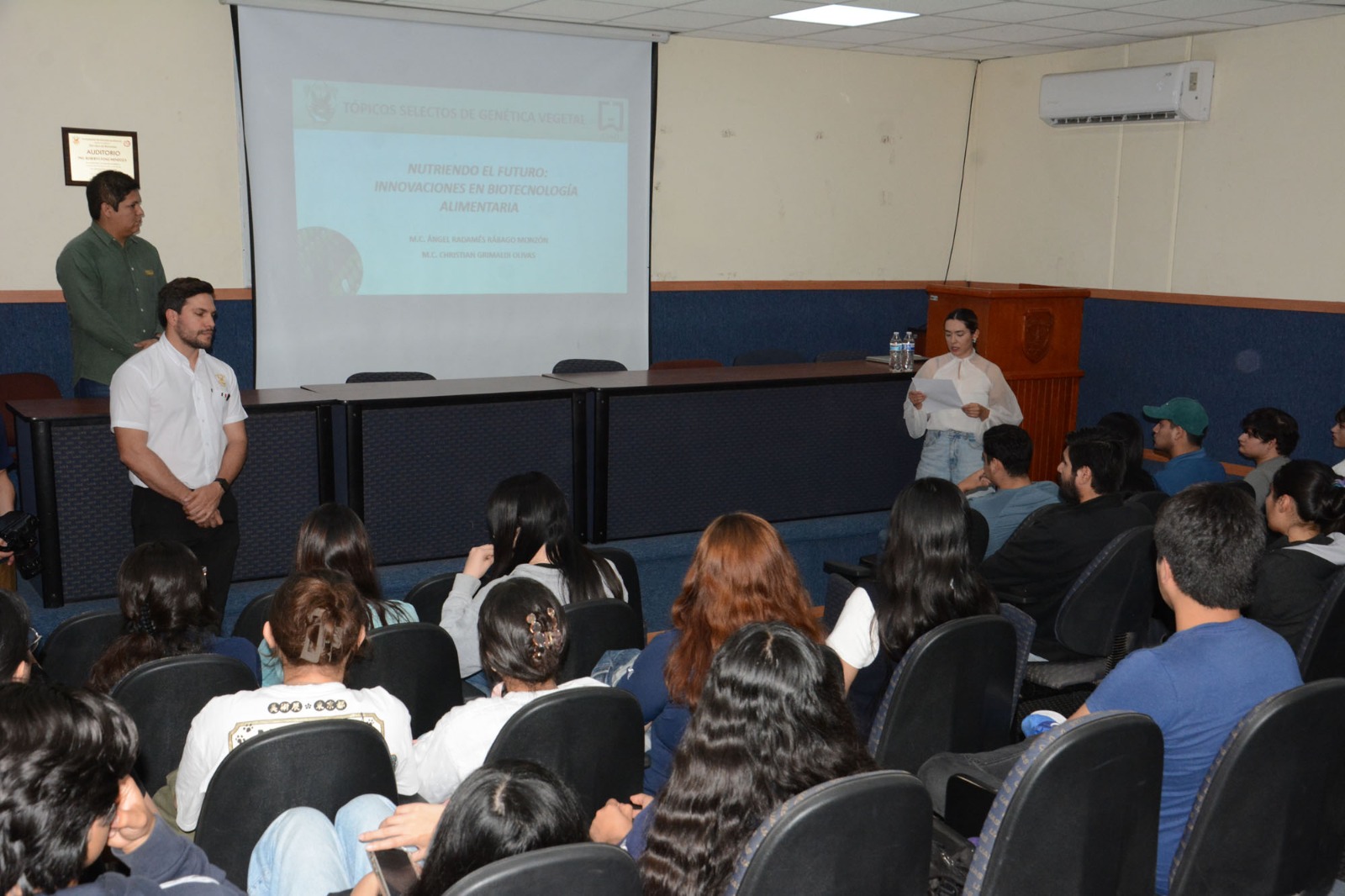Jóvenes investigadores de la Nueva Universidad, que realizan ciencia básica relacionada a la búsqueda de marcadores genéticos para la mejora de los alimentos caso de estudio el maíz de alta calidad proteínica y cultivos de pimiento morrón, compartieron parte de sus indagaciones y conocimiento con estudiantes del octavo semestre de la licenciatura en Biomedicina, esto como parte del seminario “Tópicos selectos de Genética Vegetal, bajo la conferencia Nutriendo el futuro: Innovaciones en Biotecnología Alimentaria”. Ángel Radamés Rábago Monzón y Cristian Grimaldi Olivas, investigadores del Centro de Investigación, Alimentación y Desarrollo…