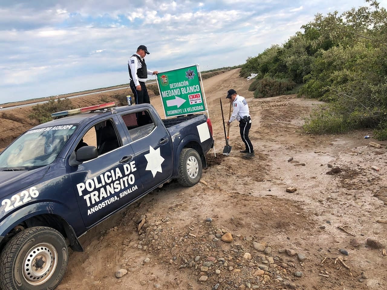 Jonadab Leyva Benitez manifiesta que tradicionalmente los vacacionistas que salen de la zona norte de Angostura hacia el Médano Blanco, lo hacen por un camino de terraceria donde tienen que cruzar varios estanques de granjas acuícolas hasta llegar a la comunidad de La Brecha, Guasave, pero en esta ocasión no será así dado a que muchos metros antes está un puente del dren y ahí colocaron un letrero de desviación hasta la playa, pues es más fácil llegar por ahí y además el camino está mucho mejor.