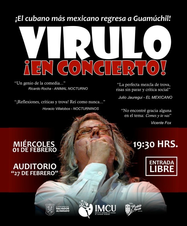 Guamúchil, Sinaloa; (Paher Portal).- Para iniciar con broche de oro los eventos culturales que se harán en el marco del 61 aniversario de la municipalización de Salvador Alvarado, Virulo presentará un gran concierto humorístico totalmente gratis en el auditorio 27 de Febrero.